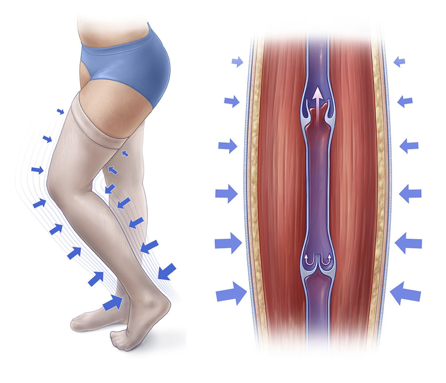 Tekanan terkontrol yang diberikan oleh stoking kompresi medis mengurangi diameter pembuluh darah besar, sehingga meningkatkan kecepatan dan volume aliran darah. Akibatnya, kompresi medis meningkatkan pengangkutan darah dari ekstremitas menuju jantung, mengurangi refluks dan stagnasi darah, serta memberikan drainase yang lebih baik dari sistem vena dalam, yang semuanya membantu meningkatkan dan memperbaiki laju sirkulasi.